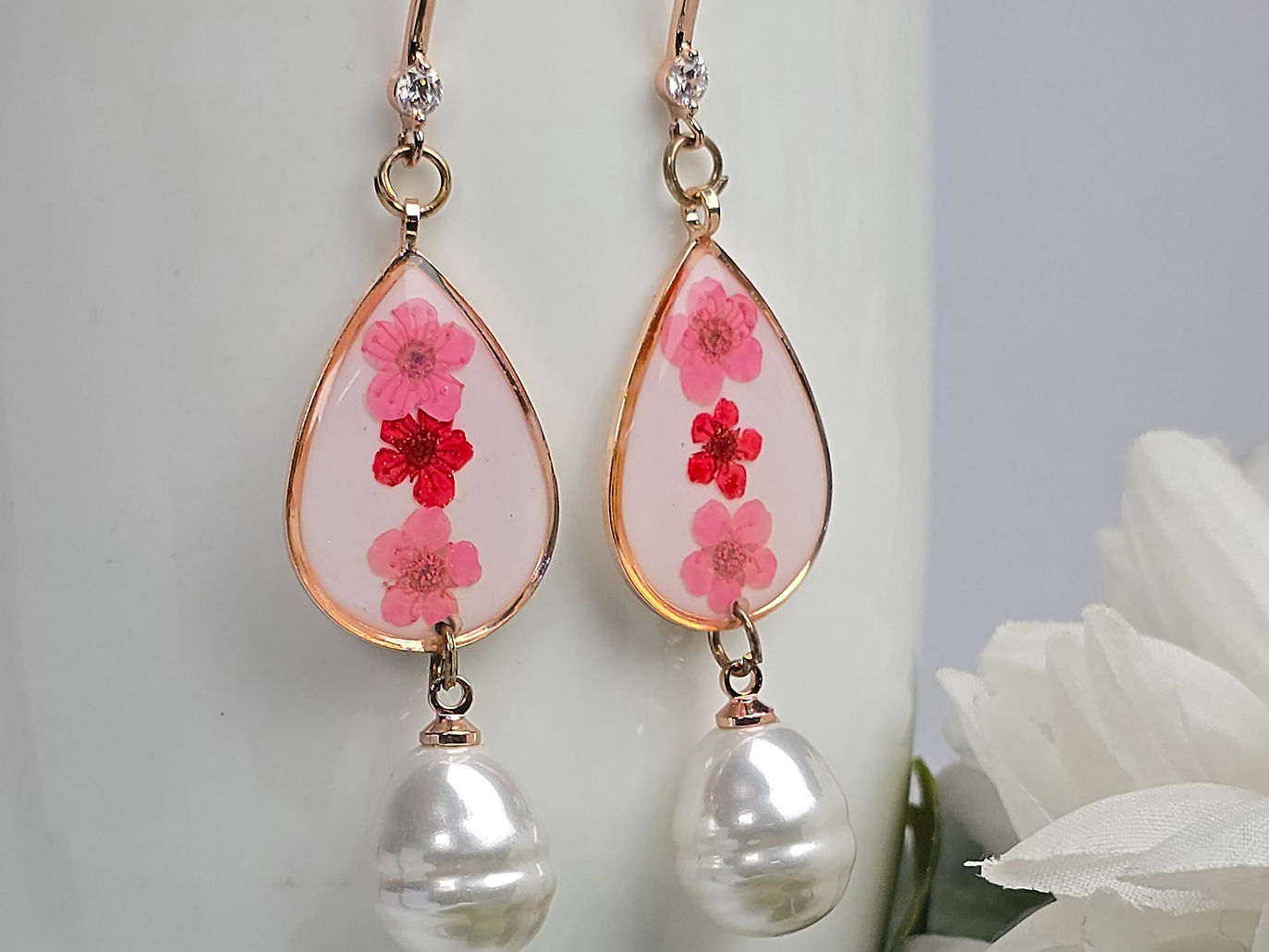 Pink Floral Earrings on Copper-Gold Base | Unique & Stylish Resin Jewelry